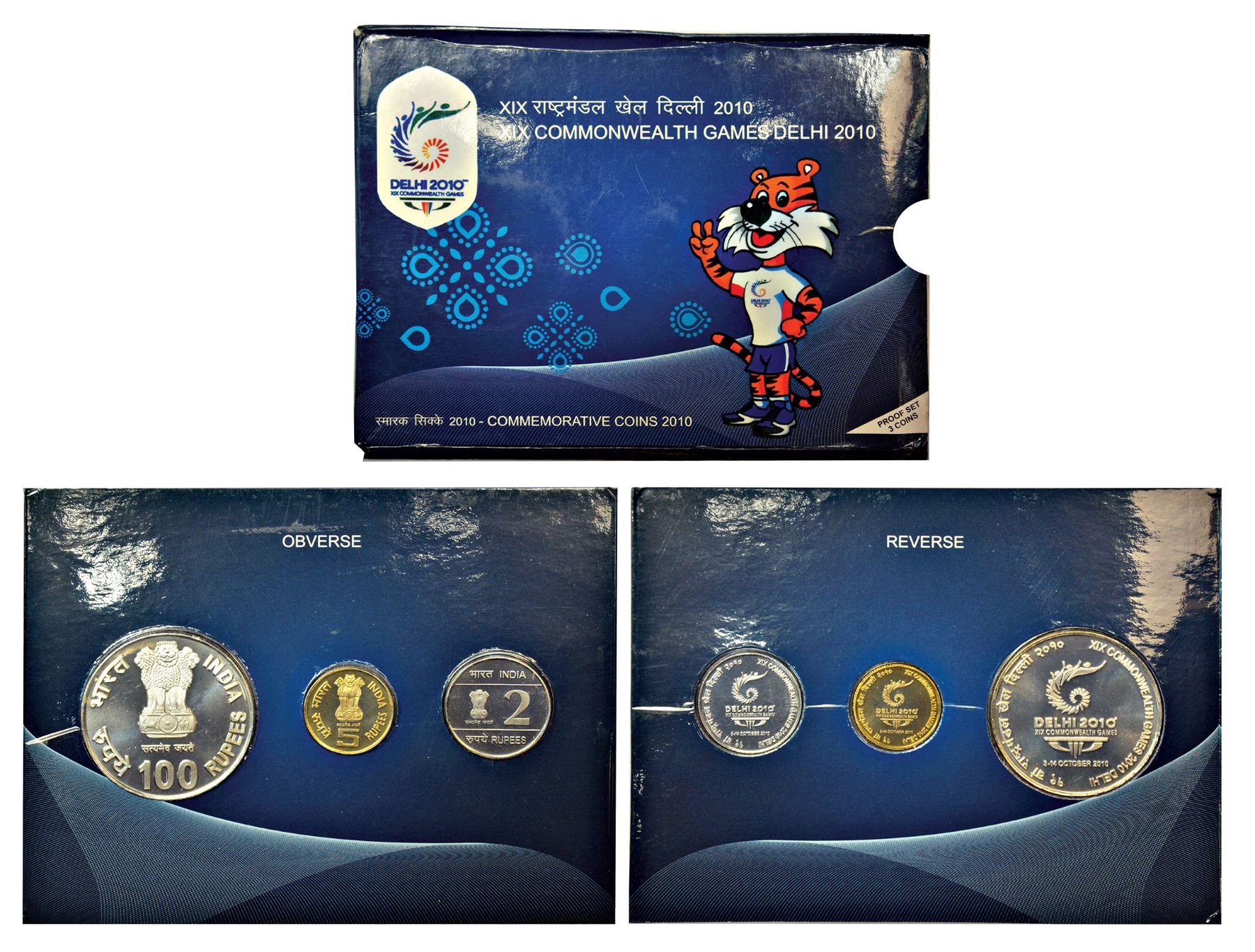 Republic of India: 2010, XIX Commonwealth Games Delhi, Proof set of 3 coins, 100 rupees, 5 rupees and 2 rupees, Kolkata mint, RB 371, in original mint packing.