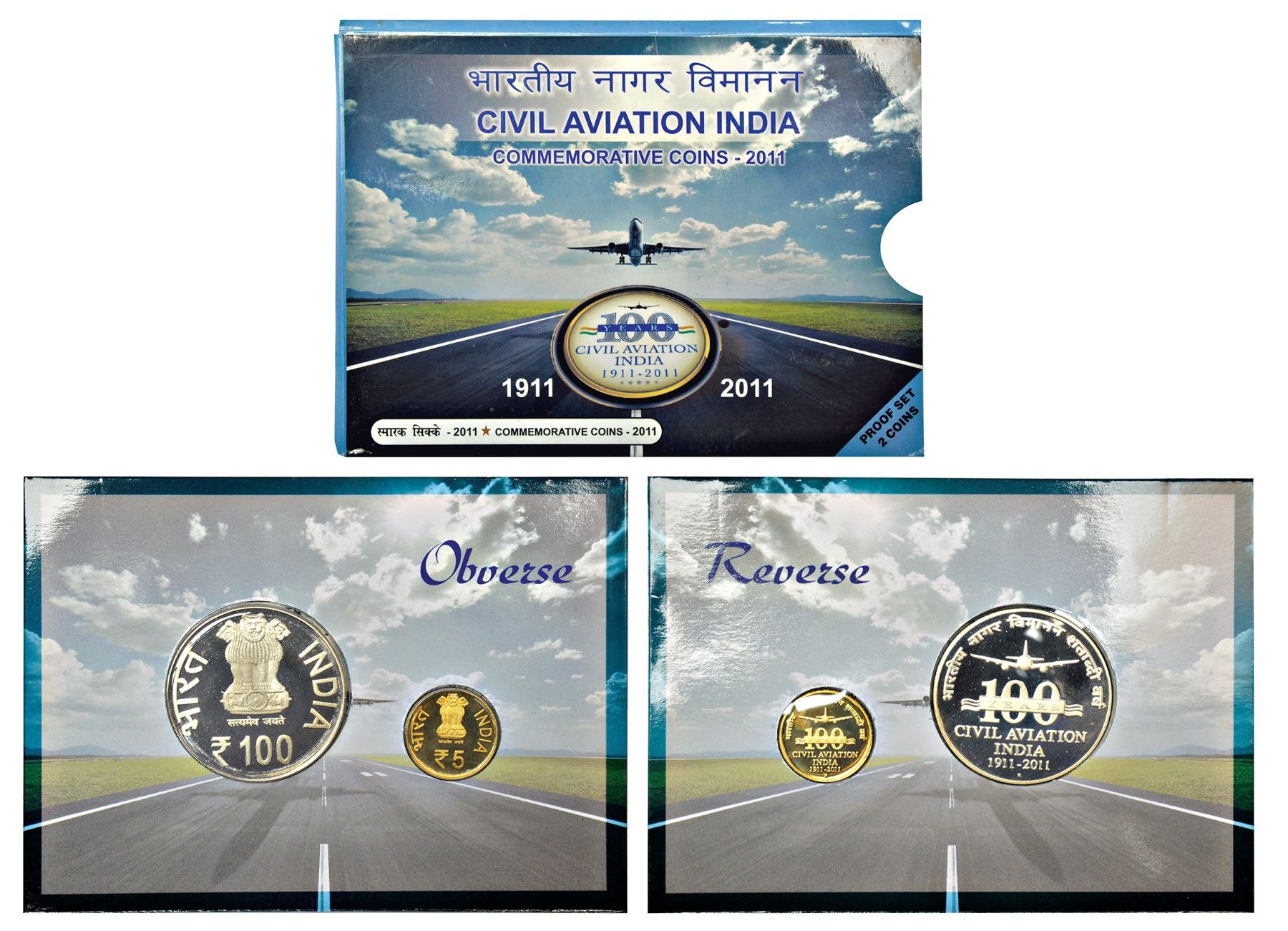 Republic of India: 2011, Civil Aviation India, Proof set of 2 coins, 100 rupees and 5 rupees, Mumbai mint, in original mint packing.