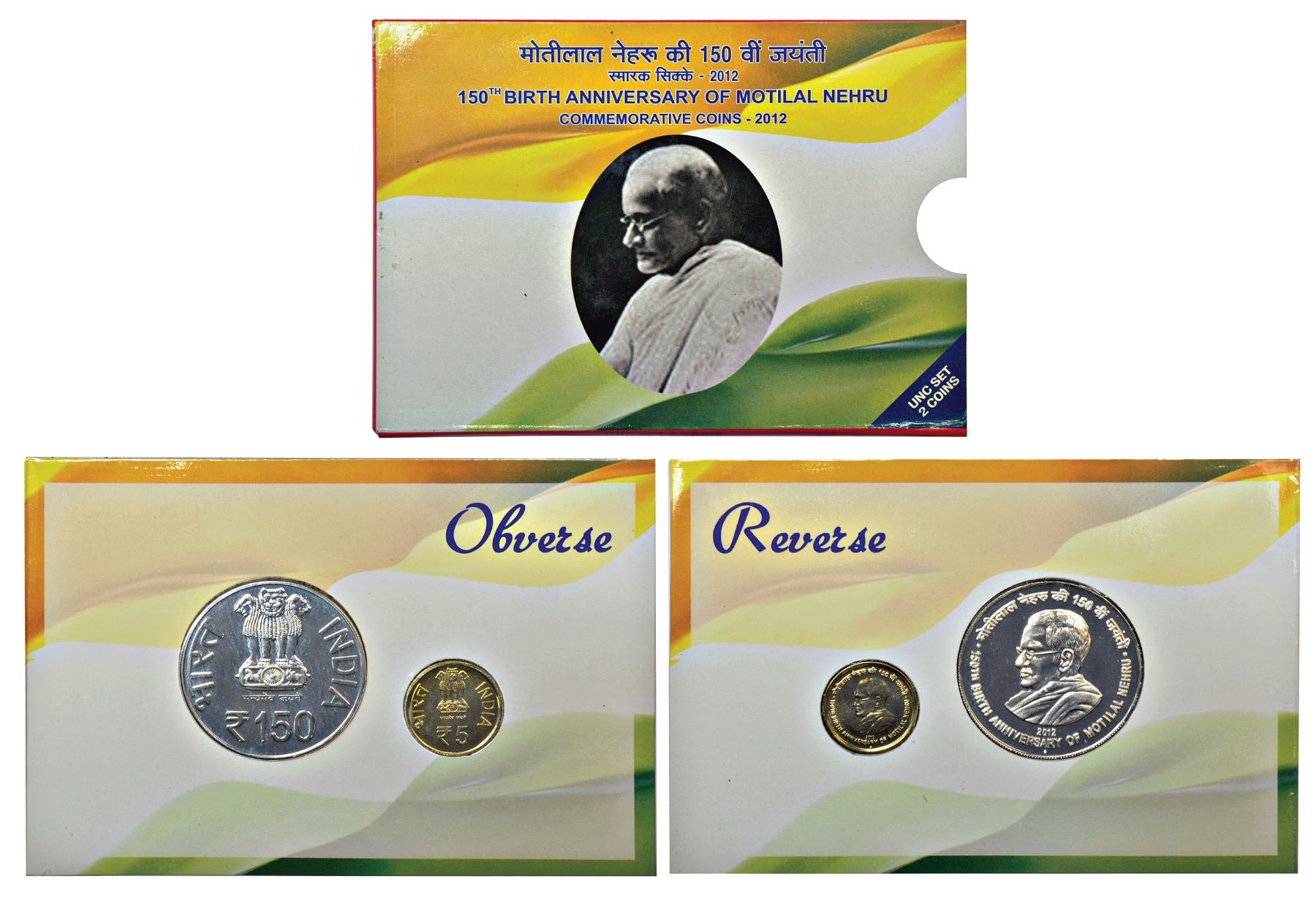 Republic of India: 2012, 150th Birth Anniversary of Motilal Nehru, UNC set of 2 coins, 150 rupees and 5 rupees, Mumbai mint, in original mint packing.