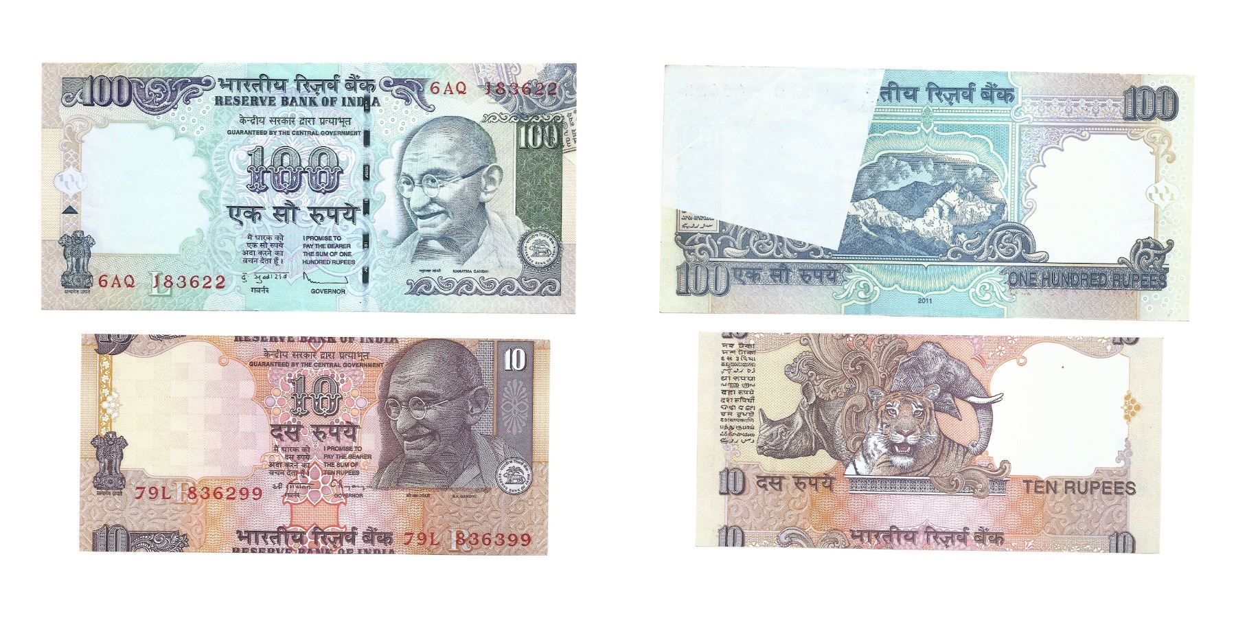 Error, Republic India, 100 & amp; 10 Rupees, Signed by C Rangarajan and D. Subbarao respectively, Reserve Bank of India, 100 Rupees is Sheet fold printing error & amp;10 Rupees is Incorrectly positioned sheet cutting error, S. No. 6AQ 183622, 5CT 79L 836299, Very Fine to UNC.