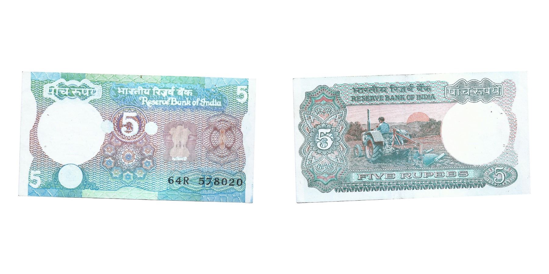 Error, Republic India, 5 Rupees Reserve Bank of India, Tractor issue, Reverse has insufficient Inking Error. Rare, S. No 64R 578020, Very fine.