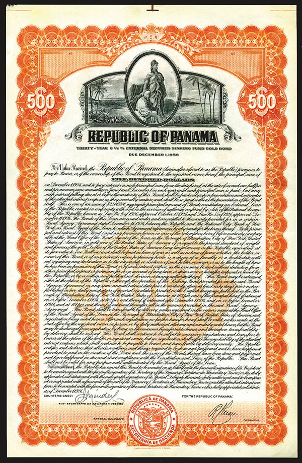 Panama, 1926, $500, Specimen bond, black and orange, XF-AU condition, Standing allegorical Liberty with Native Panamanian in middle flanked by tropical palm tree scene, Hamilton BNC.