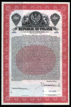 October 1st, 1936. Specimen bond. $500. Red border and undertint. 3% Dollar Funding Bond. Arms of Poland vignette flanked by allegorical angels. Written in English. Blue specimen overprints, 00000" serial numbers and POC's. Coupons attached. XF condition. ABNC. Rare Polish specimen bond.