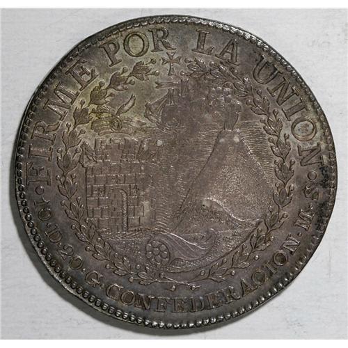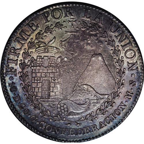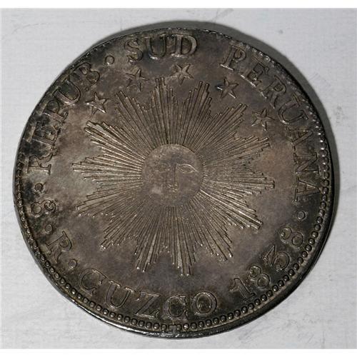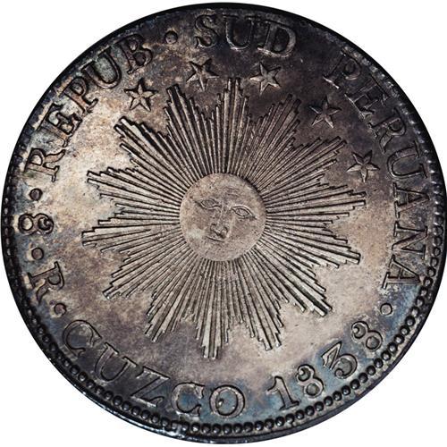 <B>Republic of South Peru 8 Reales 1838-MS Cuzco, </B></I>KM170, deeply toned AU, a gorgeous coin with full underlying mint brilliance. Rare and very desirable in this premium quality.<BR><BR><b>Shipping:</b> Coin/Currency (<a target="_blank" href="http://www.heritageauctions.com/common/shipping.php">view shipping information</a>)