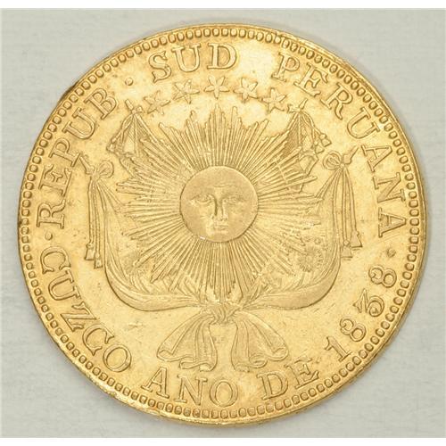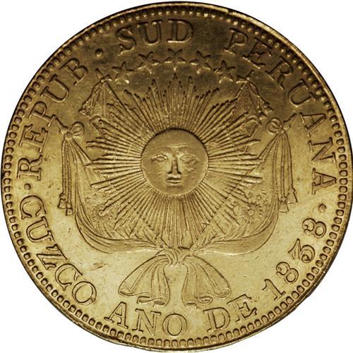 <B>Republic of South Peru gold 8 Escudos 1838-MS Cuzco, </B></I>KM171, lustrous XF, few small contact marks and a tiny edge bruise but a nicely struck example without the planchet flaws that often plague this issue. Rare and very popular sunface type.<BR><BR><b>Shipping:</b> Coin/Currency (<a target="_blank" href="http://www.heritageauctions.com/common/shipping.php">view shipping information</a>)
