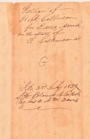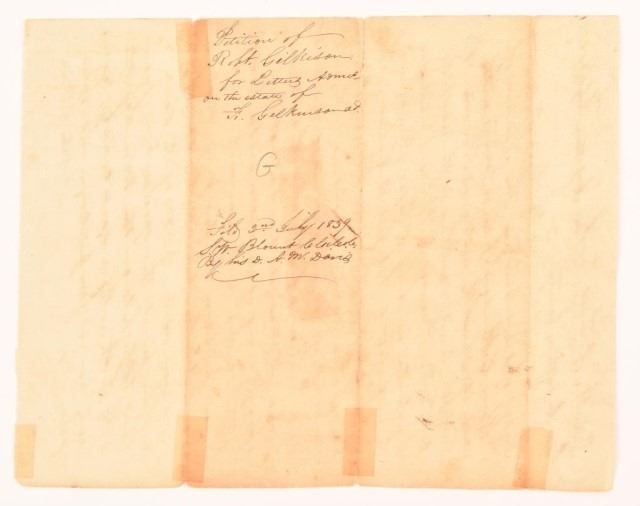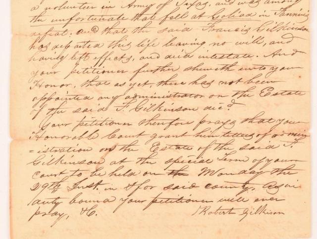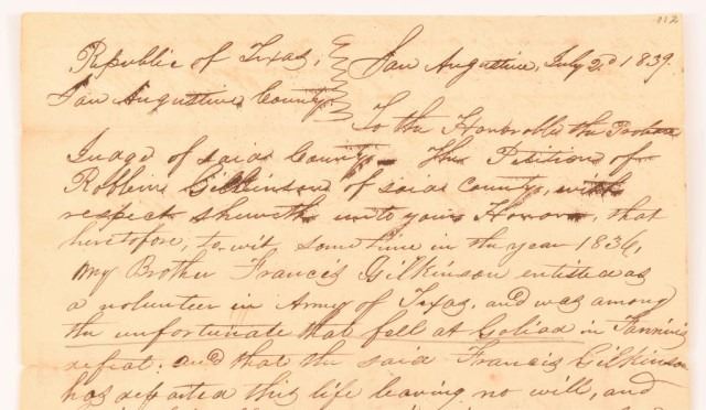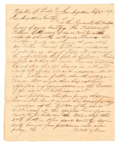 Dated July 20, 1839 petition to settle the estate of Francis Gilkinson, who was killed at the Goliad Massacre on March 27, 1836. The petition is signed by Robert Gilkinson on behalf of Francis.