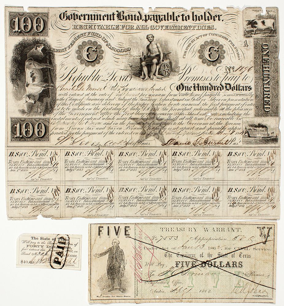 c1836 Lot of 3: first is a $100 bond certificate, complete with 10 revenue stamps below. This large 10"x7.5" note is crowded with 4 vignettes, medallions, the Texas star, and denomination indications. The litho was printed by the Southern Bank Note Co. Endicott & Clark New Orleans. It is signed by David G. Burnet, the first Governor of the Republic. Second is a $5 dollar note from the State of Texas, dated 1862. This has a cancellation "X" through its center. Third is a State of Texas Revenue stamp good for $40 dollars, dated January 1863. The Republic of Texas existed from 1836, when it gained independence from Mexico, to 1846. After numerous battles with the Commanches, and with Mexico, it was annexed by the US in 1845, becoming a state in 1850. Lynn Langdon Collection - HKA#65644