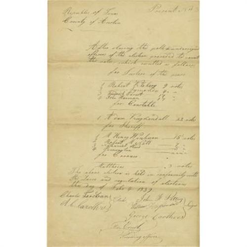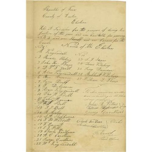<B>Republic of Texas Manuscript Voting Document Signed,</B></I> "<I>John F. Pettus</B></I>", "<I>Fr. Ernst</B></I>", "<I>William Kuykendall</B></I>" and others, two pages with docketing on a second integral panel, 7.5" x 12.5", Austin County, February 4, 1839. The cover summarizes voting results for elections naming Austin County's justice of the peace, constable, sheriff and coroner. The second page names 27 participating electors. Light aging, else fine condition. The primary signatory, Pettus, was a recent veteran of the Texian Revolution, having participated in the battles at San Antonio de Bexar and San Jacinto. This document, bearing the names of so many early settlers, is worthy of further research. <I>From the collection of Darrel Brown.</B></I><BR><BR><b>Shipping:</b> Flat Material, Small (<a target="_blank" href="http://www.heritageauctions.com/common/shipping.php">view shipping information</a>)