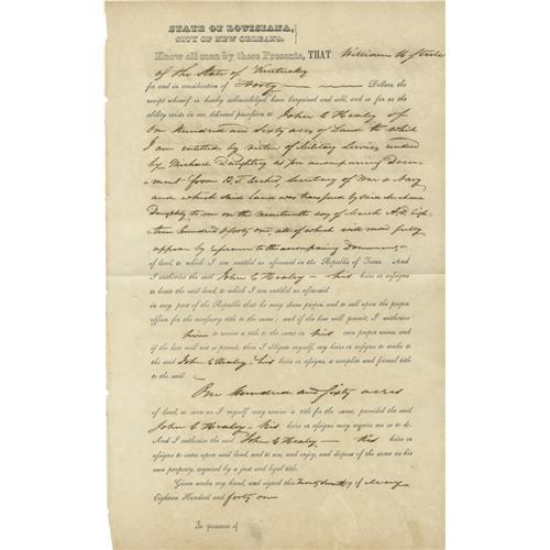 <B>Republic of Texas, Military Service Land Grant Transfer.</B></I> A partially printed document transferring 160 acres of land granted to Michael Daughtry for military service to John C. Healy of Kentucky. The document was executed by William Bryan, Consul of the Republic of Texas for the City and Port of New Orleans, on May 27, 1841. This interesting document is in excellent condition. 7.75" x 12.5".<BR><BR><b>Shipping:</b> Flat Material, Small (<a target="_blank" href="http://www.heritageauctions.com/common/shipping.php">view shipping information</a>)