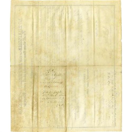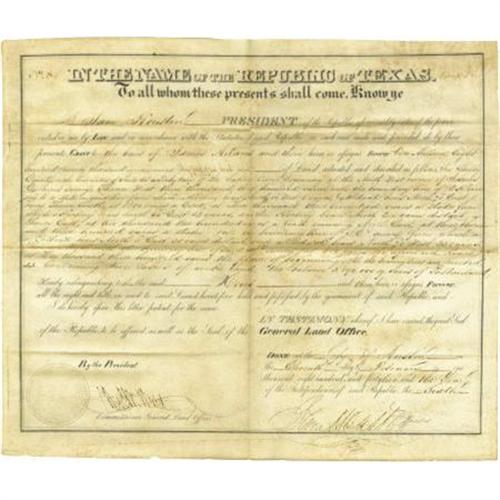 <B>Republic of Texas President Sam Houston Document Signed,</B></I> one page with verso docketing, partially printed on vellum, 14.75” x 12.75”, Austin, Texas, February 11, 1842, countersigned by General Land Office Commissioner Thomas W. Ward. This fabulous early Texas document awards “<I>Ten Million Eight hundred & ninety thousand square varas</B></I>” of land in Shelby County to veteran James Adams. A “vara” is a Spanish unit somewhat smaller than a yard. A few pinholes, attractive browning, smoothed folds and crisp edges. Some fading to the inscriptions, overall fine condition.<BR><BR><b>Shipping:</b> Flatware (<a target="_blank" href="http://www.heritageauctions.com/common/shipping.php">view shipping information</a>)