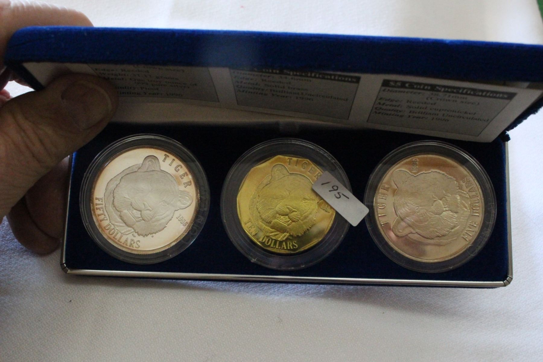 1996 Tiger Commemorative Coin Set; (1) $50 Proof - .999 Silver; (1) $10 Solid Brass; (1) $5 Coin - Solid Cupronickel (All in Quadrans & Blue Velvet Case)