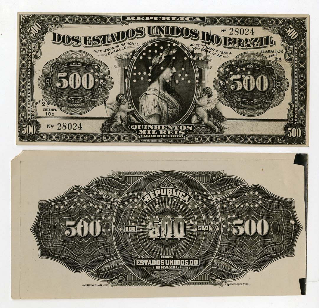 Brazil, E.10A (1911). 500 Mil Reis, P-87p, Obverse and Reverse Photo Proofs, Black and white photos printed on glossy paper, Obverse shows woman with wreath at center flanked by cupids, Reverse shows denomination at left right and center with name at center, Photo shows that original was pin punched specimen, Front has S/N 28024, ABNC. All are photo proofs of original specimen or proof notes that were by different printers to be used for reference or they were used during the production process to determine if the design and text were correct and also to be used for approvals and their printing records. These were from the Thomas De La Rue production and design department. XF to Uncirculated condition. (2). Sold "AS IS" no returns accepted.