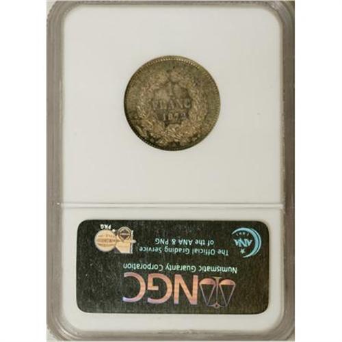 <B>Republic silver 1 Franc 1872-A,</B></I> KM-822.1, Small A, MS63 NGC, beautiful toning.<BR><BR><b>Shipping:</b> Coins & Currency (<a target="_blank" href="http://www.heritageauctions.com/common/shipping.php">view shipping information</a>)