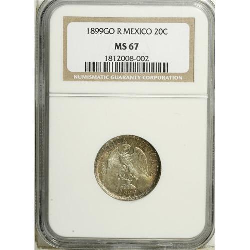 <B>Republic silver 20 Centavos 1899-GoR,</B></I> KM-405.1, MS67 NGC, glorious iridescent golden green toning, crisp strike on the eagle, some soft areas near the rim on the other side--one of the finest to be found anywhere!<BR><BR><b>Shipping:</b> Coin/Currency (<a target="_blank" href="http://www.heritageauctions.com/common/shipping.php">view shipping information</a>)