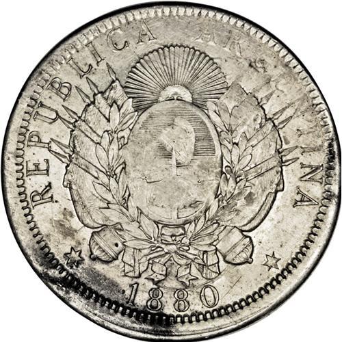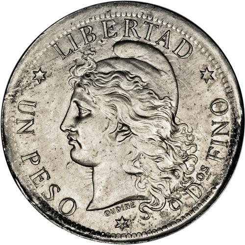 <B>Republic silver Pattern Peso 1880, </B></I>KM-Pn20, AU with original mint luster, crudely produced and struck partially outside the collar creating an unusually wide rim and an uneven edge. The central details on the reverse are not well struck up. An extremely rare and important pattern issue for the regular coinage which commenced in 1881. In describing Pn20 KM states that the business strike reference number is KM4, but that should have been updated to KM29.