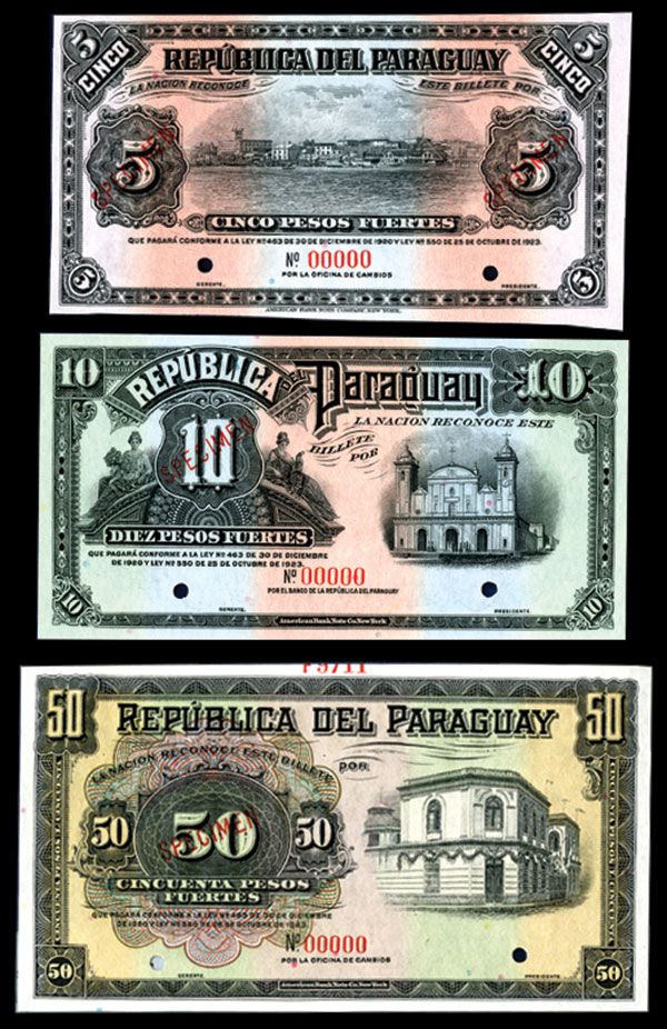 Paraguay, Lot of 3 notes, all Ley of 1923, Includes 5 Pesos Fuertes, P-149s, PMG graded CU 64 EPQ, one of only 2 notes graded and tied for finest; 10 Pesos Fuertes, P-150s, PMG graded Gem Unc. 66 EPQ, one of only 2 notes graded and tied for finest; 50 Pesos Fuertes, P-151s, PMG graded Gem Unc. 66 EPQ, one of only 4 notes graded and tied for finest, scarce high grade banknote trio. ABNC.