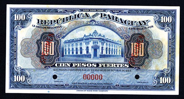 Paraguay, 1923, 100 Pesos, P-167s, Specimen, Blue on m/c underprint, Appears choice Unc. but there is toning from previous mounting or storage. ABNC.