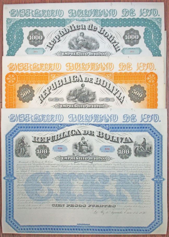 Bolivia, 1870. Lot of 3, U/U Remainder Coupon Bonds in Spanish. All are 16.5 inches x 22 inches. Includes: 100 Pesos Fuertes in blue, S/N 636, there are 3 allegorical figures at top; 500 Pesos Fuertes in orange, S/N 214, seated allegorical woman in middle; and, 1000 Pesos Fuertes in green, S/N 203, seated allegorical reaper with beehive in middle. All are very large formatted and in bold colors. All coupons on bottom are intact as well as register foil on top. AU-Uncirculated. ABNC. (3)