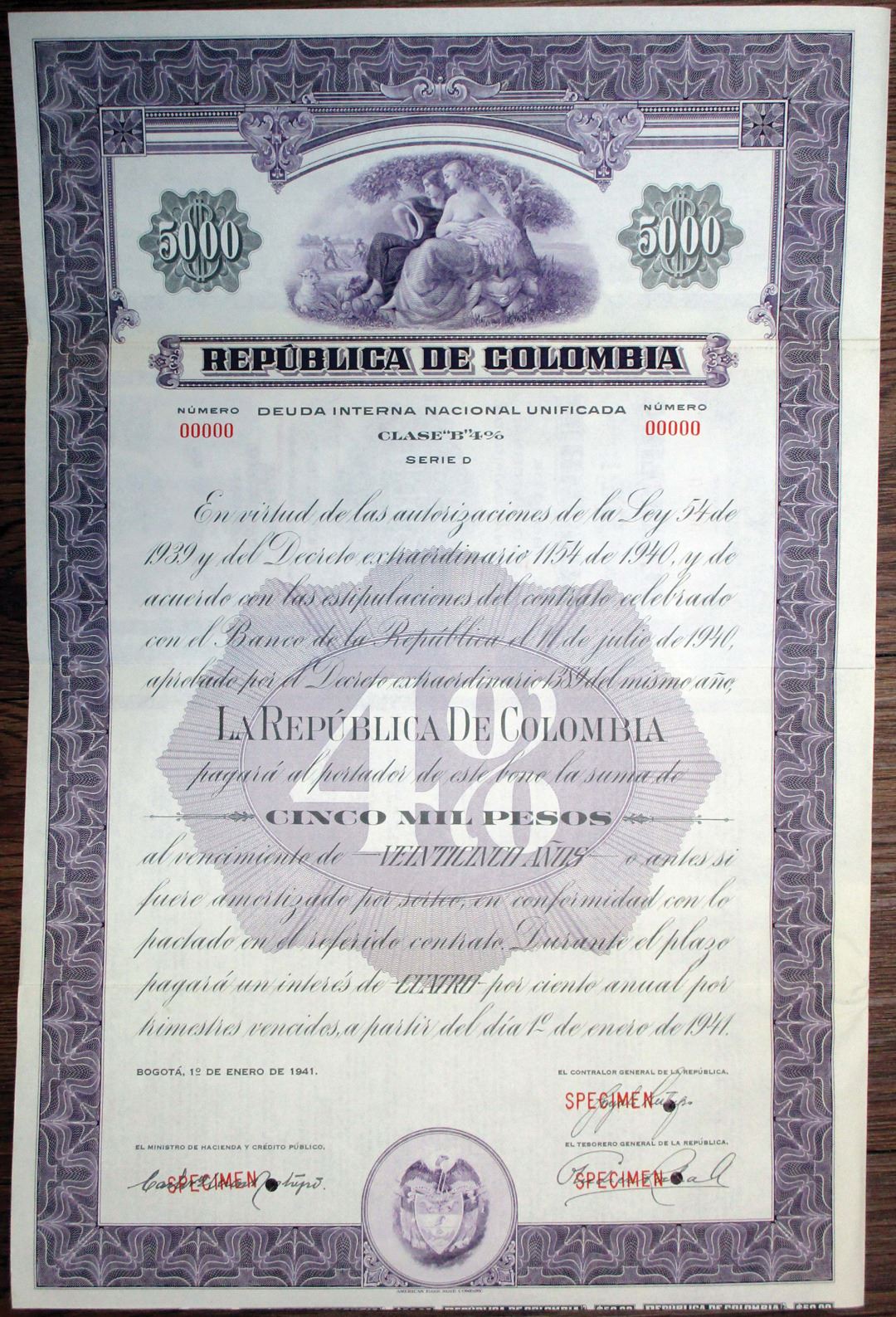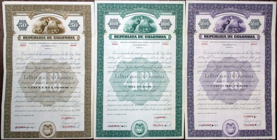 Colombia, 1941, Lot of 3 pieces, Includes: $5000 Specimen 4% Coupon Bond in purple; $50 Specimen 4% Coupon Bond in brown; $1000 Specimen 4% Coupon Bond in green. All are in Spanish, have red specimen overprints, 00000 serial numbers, and POCs. VF condition, ABNC. (3)