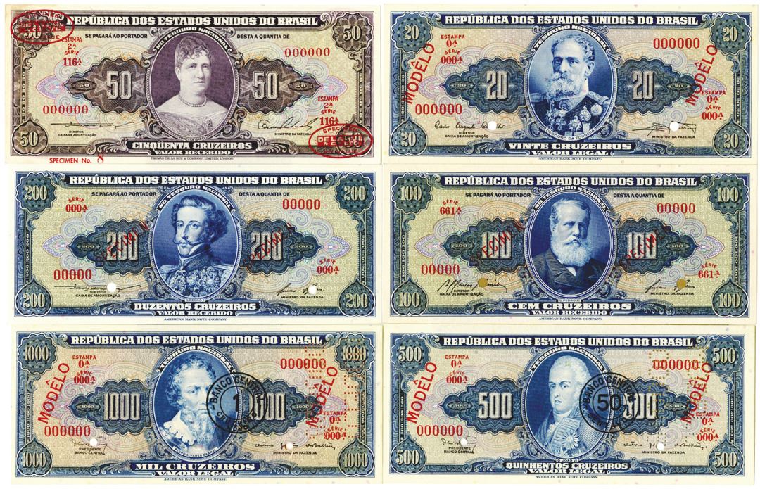 Brazil. Lot of 6 notes, Includes 20, 50, 100, and 200 Cruzeiros, also a pair of overprinted 50 Centavos over 500 Cruzeiros and 1 Cruzeiro over 1000 Cruzeiros, all with zero serial numbers, and SPECIMEN or MODELO overprint. ABNC and TDLR. P-168s; 169s; 170s; 171s; 186s; 187s. Choice to Gem Uncirculated. (6)