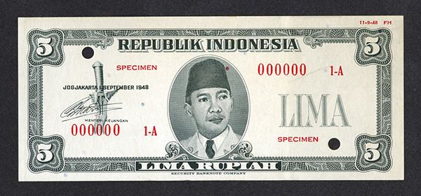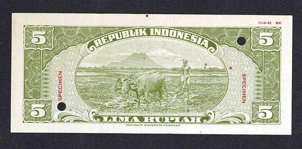 Indonesia, September 1, 1948, 5 Rupiah, Series 1-A, P-Unlisted 5a, Essay specimen banknote of a Security BNC proposed and never issued 1948 Indonesia banknote Series. Black without underprint, Portrait of Sukarno, back gray-green with man plowing with oxen with mountains in background, Choice AU to Uncirculated with toning on right face, Red specimen overprint, POC and "00000" serial numbers. Evidently Indonesia did not accept this Security Banknote Company issue. POC.