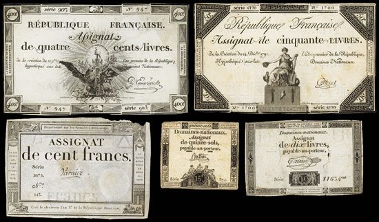 France, 1792, Lot of 4 notes, Includes 50 Livres, P-A72; 100 Livres, P-A73, AU-Unc.; 1795 Franc Issue, 100 Francs, P-A78; 1791 Third Issue, 10 Livres, P-A51; 1792 Third Issue, 15 Sous, P-A65, lot of 5 Assignats, various condition from VG to AU.