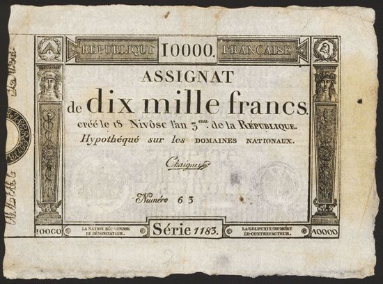 France, January 7, 1795, 10,000 Francs, P-A82, Issued banknote, Black with ornate borders, embossed seals on lower left and right, back blank, Ser. 1183, Chaignet signature, Choice Fine to VF condition, small hole in excess right margin, scarce high denomination Assignat.