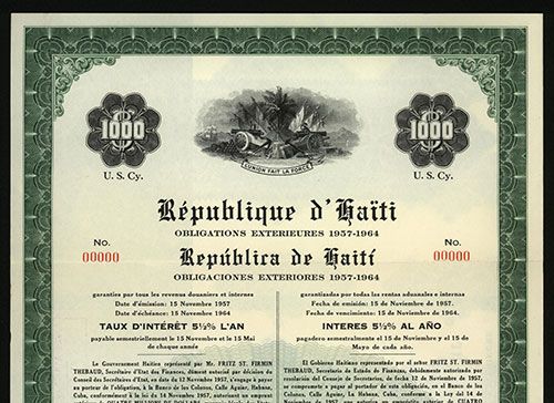 Haiti, 1957, $1000, 5 1/2% Specimen Bond, Vertical format, Black on green border and underprint, Haitian seal top center, VF condition, ABNC.