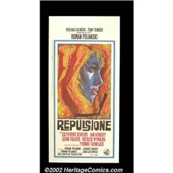 Repulsion (1965) Italian Locandina. Catherine Deneuve's sexual repressions lead her into a mental breakdown in this landmark film from Roman Polanski! This colorful locandina may be the single best image from this disturbing picture! Very fine on paper.  Important notice: We expect to be auctioning lots at the rate of 200-250 per hour. Sometimes eBay Premier live bid software cannot keep up with that pace, so we strongly recommend that you place a realistic proxy bid now as insurance to avoid disappointment. Also please note that all Heritage/CAA lots purchased through eBay Premier carry a 20% Buyer's Premium.