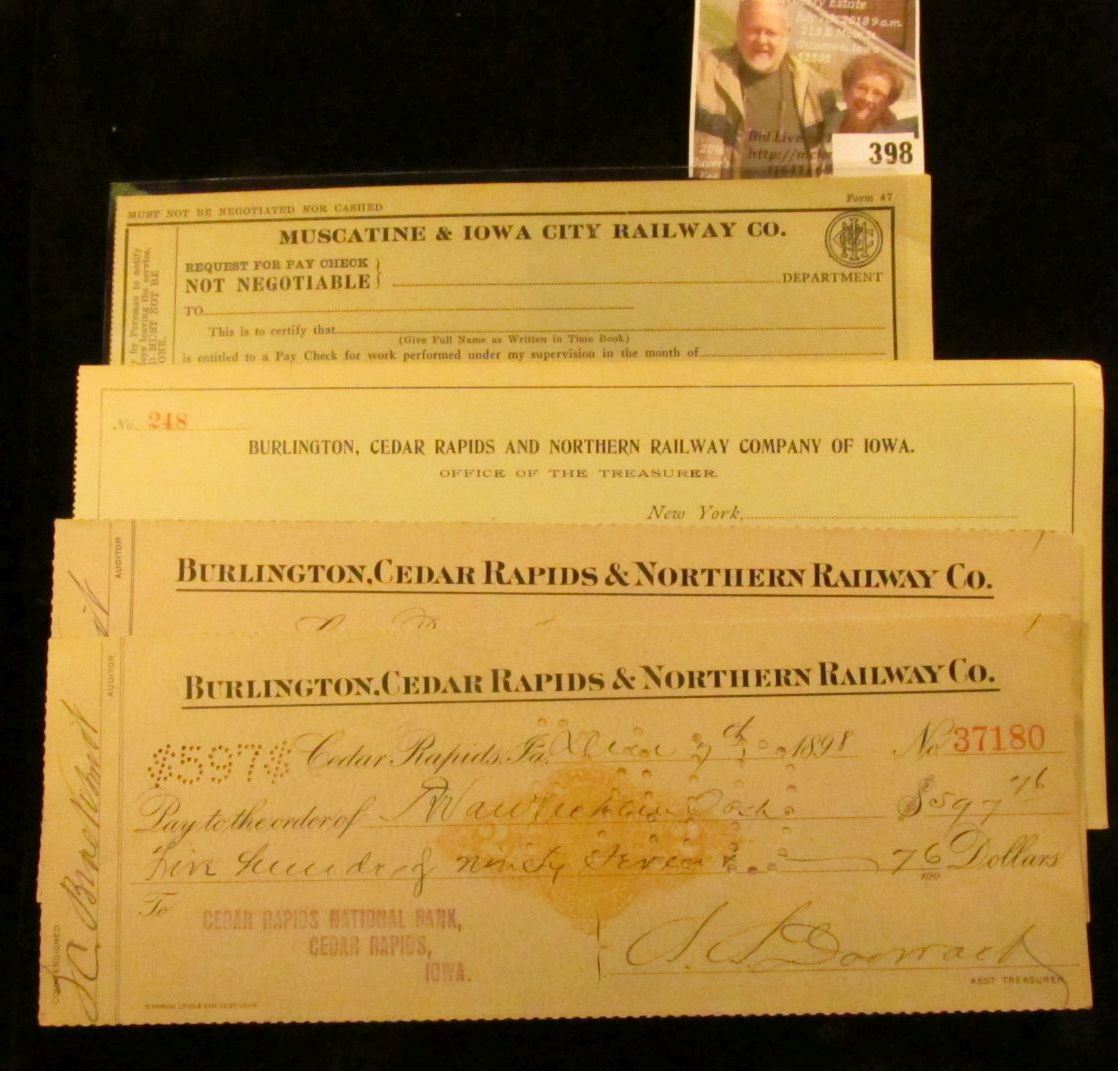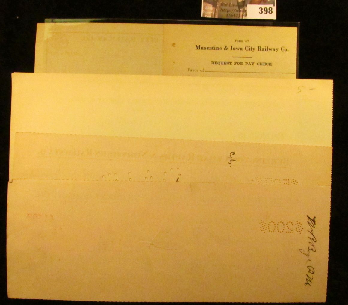 "Request for Pay Check…Muscatine & Iowa City Railway Co…." unissued; unissued receipt No. 248 "Burlington, Cedar Rapids and Northern Railway Company of Iowa. Office of the Treasurer…"; pair of "Burlington, Cedar Rapids & Northern Railway Co." checks with Gold preprinted Internal Revenue Stamps in center.