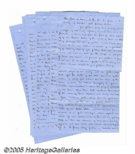 <B>Request for the Seizure of Slaves in Galveston, Texas</B></I> Circa 1853, request for seizure of slaves, Galveston, Texas. Choice extremely fine. Manuscript document on blue, fine-laid paper, 9 1/2 pages, 12.25" x 6.5", the pages are held together with a brad fastener. This lengthy legal petition by <I>"Nancy Hunt, formerly Nancy Loggins,"</B></I> requests a considerable amount of money from the estate of John D. Amis in order to settle Amis's debts. Hunt extensively details the transfer of ownership of several slaves by Amis, and claims that he had deeded the slaves to his daughter in order to prevent the slaves being taken by creditors. On behalf of herself and other creditors, Hunt asks the court to declare the gift invalid, and either deliver the slaves of the estate or their financial value to the creditors. The slaves named include: Henry, Arthur, Cameron, Leonidas, Havana, Indiana, Matilda, Theodosia, Laura, Henry (a boy), and Henrietta. Most are adults, but a few are the children of Matilda and Henry. Lot:251