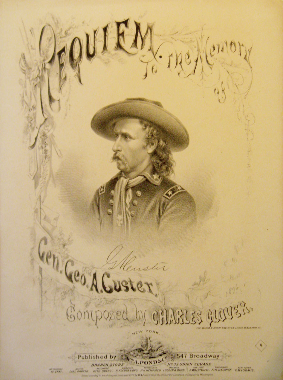 sheet music by Charles Glover, pub. by Wm. A. Pond & Co.,1876. Very rare 4 pp. songsheet published the year of Custer’s death; illust. w/ an incredible lithograph of Custer. 11” x 14”.
