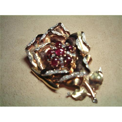 Impressive 18 kt. yellow, green gold, rose gold , platinum rose blossom brooch, C. 1940, set with 5 baguette diamonds totalling .41 carat, 5 diamonds totalling .23 carat, 65 round dsingle-cut diamonds totalling 1.90 carats, of H color, SI uality, and 5 large cabochon rubies totalling 8.5 carats, with safety chain