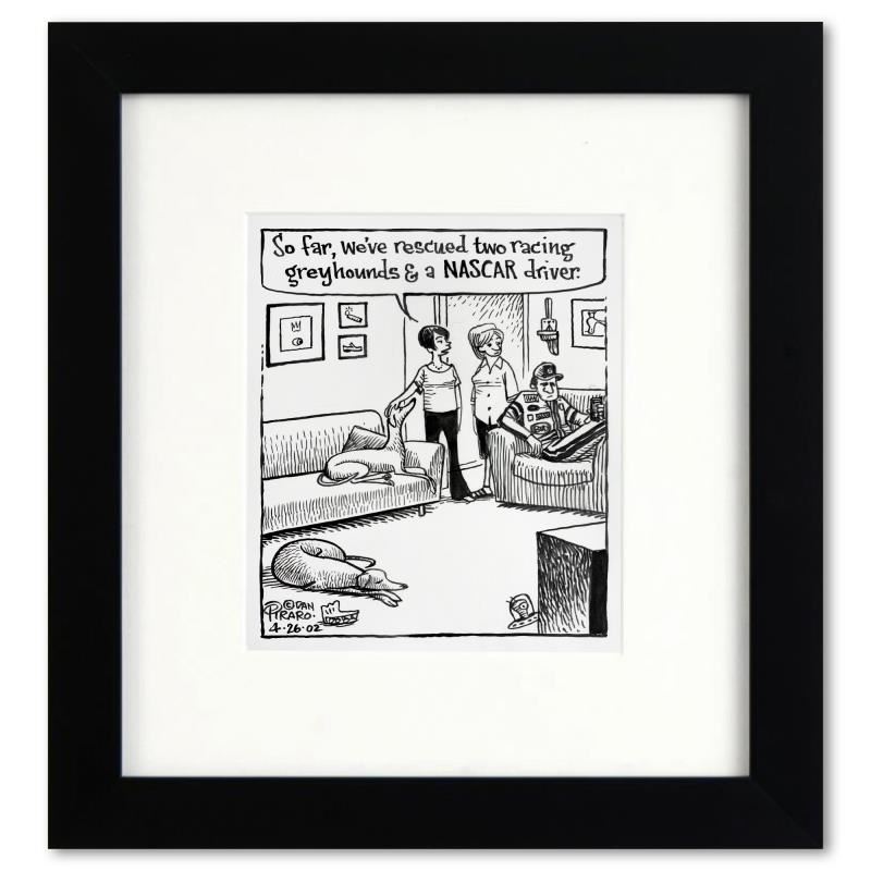Enter a surreal and satirical world of twisted imagination and award winning creativity. "Rescue Home" is an original pen & ink drawing on paper by Dan Piraro, creator of the critically acclaimed and award winning comic strip, Bizarro. This piece is hand signed, comes custom framed and includes a letter of authenticity. Measures approximately 12" x 11" (frame), 7" x 6" (image).This item requires special handling and may have a longer than usual turnaround.