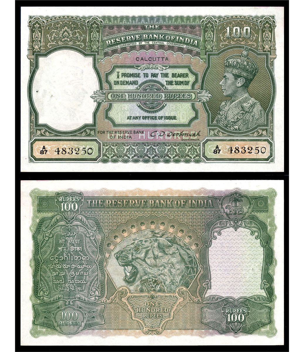 Calcutta, India. ND (1937). 100 Rupees, P-20e Jhun4.7.2, Issued banknote, Deshmukh signature, S/N A/87 483250, King George VI on right, tiger on back. PMG graded Choice About Uncirculated 58, attractive note that appears choice uncirculated at first glance with large even margins, but there is one corner tip slightly bent that keeps this from a higher designation. A superior example for the grade. One of two sequential 100 Rupee notes being offered.