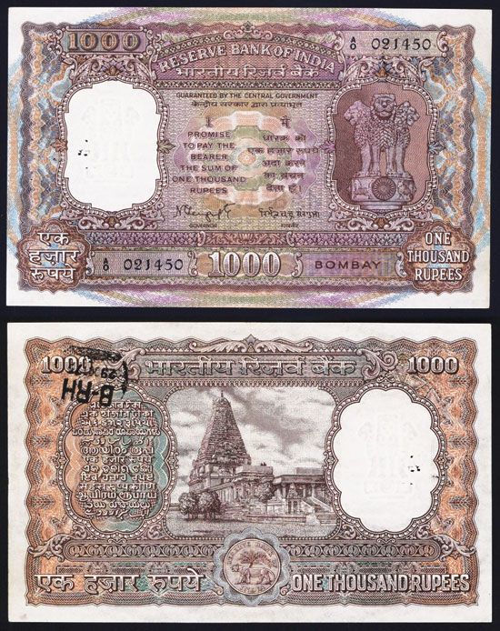 Bombay, India, ND (1975), 1000 Rupees, P-65a, Issued banknote, Text in English and Hindi Brown on m/c underprint, S/N A/O 021450 on LL and UR, Signature 79 - N.C. Sengupta, GOVERNOR at center left, the note appears XF to AU but would grade VF to Choice VF but the quarter folded note was evidently pressed at sometime in the past as well as having to corner tips bent, large even margins, sharp corners and bright colors only enhance this lovely note, the usual 4 staple holes on left, attractive note.