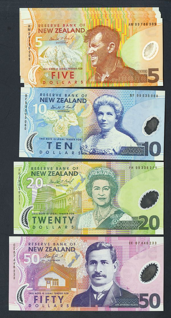 New Zealand. 5, 10, 20, 50 Dollars. SCWPM 185a (thick dark serial #) and (thin light serial #); 185b, 2003, 4, 5 (2), 6; 186a 1999 First year, 187a 1999 first year; 188b 2007. All Very Choice Uncirculated or better. 10 pieces. (Arthur C. Matz Collection)