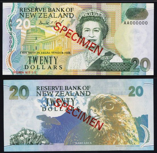 New Zealand, ND (1992), $20, P-179s, Specimen banknote, Queen Elizabeth in middle, back with New Zealand falcon, Signature of D.T.Brash, S/N AA000000, Red SPECIMEN overprint, lower left border has small red SPECIMEN No. 88, PMG graded Choice Uncirculated 64 EPQ (Exceptional Paper Quality), Superb note that is possibly being offered as a specimen for the first time publically. TDLR.