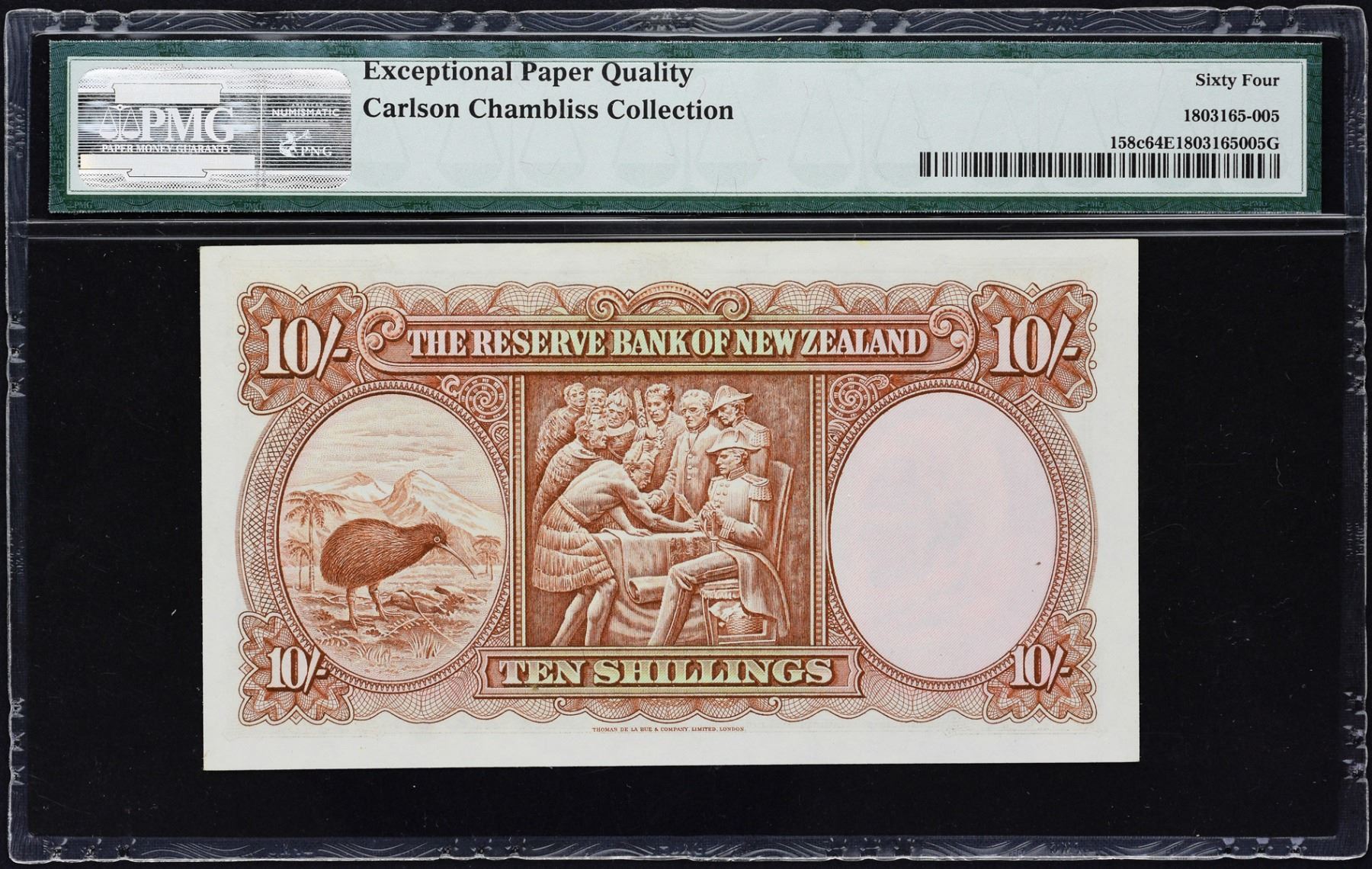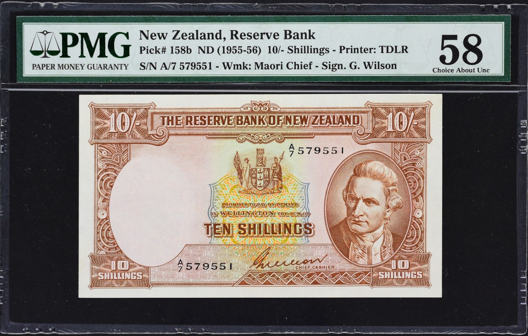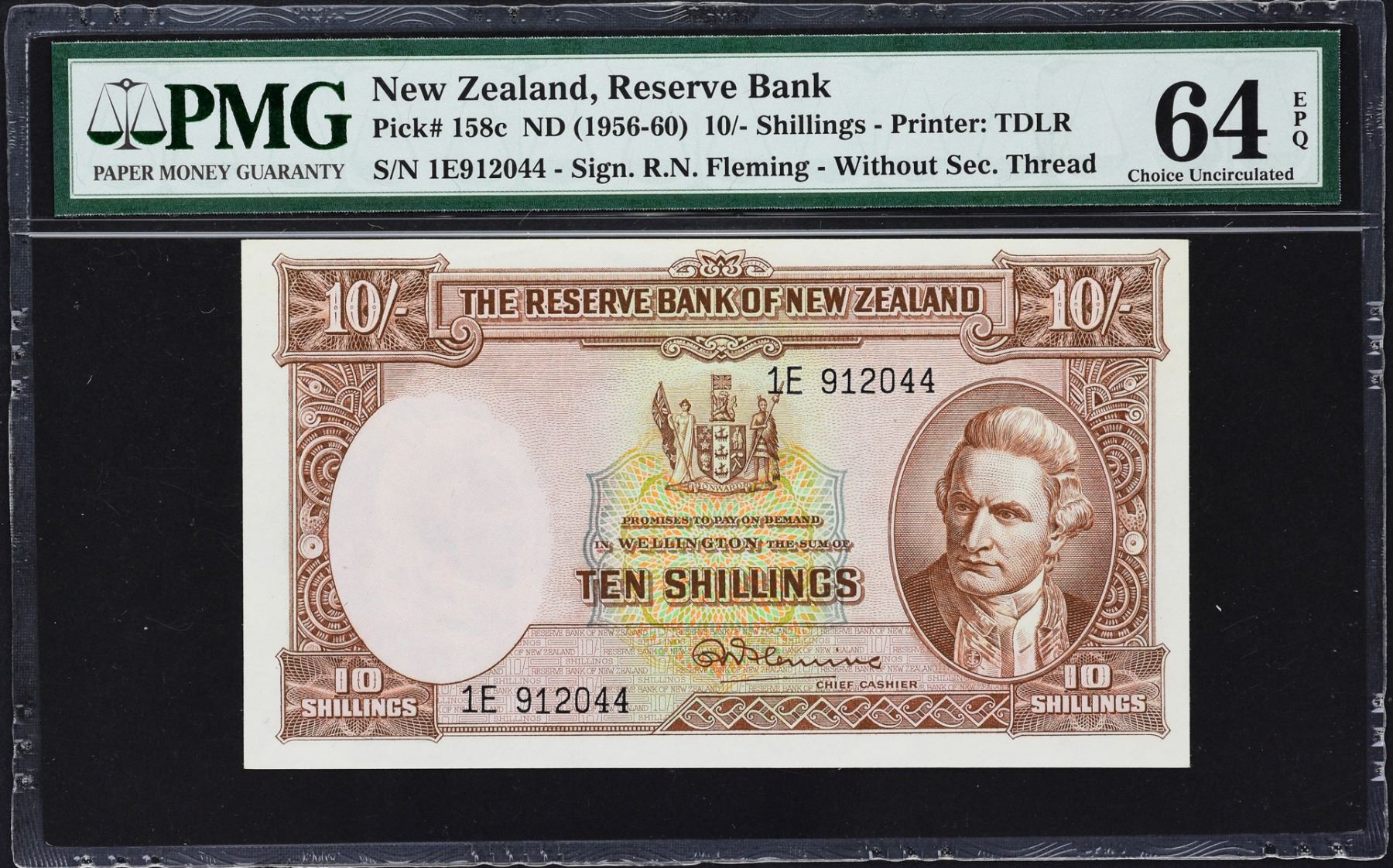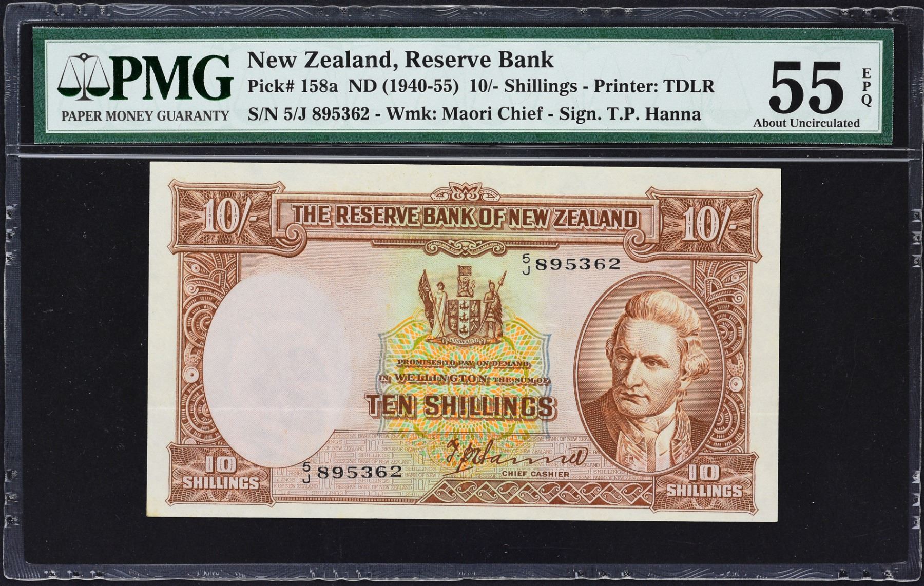 6 pieces in lot. A nearly complete variety set for this 10 Shillings design with the following; P-158 5/J block in About Uncirculated 55 EPQ; P-158a I/54(Dated) block in Choice About Uncirculated 58 EPQ; P-158b A/7 Block in Choice About Uncirculated 58; P-158b 0K block in Extremely Fine 40; P-158c 1E block in Choice Uncirculated 64 EPQ; P-158d 7L block in Choice Uncirculated 63 EPQ.