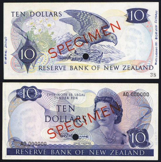 New Zealand, ND (ca.1967-81). P-166s. $10. Unlisted specimen with Hardie signature. Specimen banknote. Red Specimen overprint, ÒA000000Ó serial numbers, POC's. PMG graded Choice Uncirculated 64 with notation of ink annotations on back, Queen Elizabeth II at right facing left, TDLR. Rare banknote as specimen.