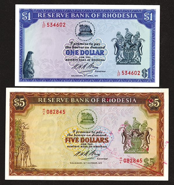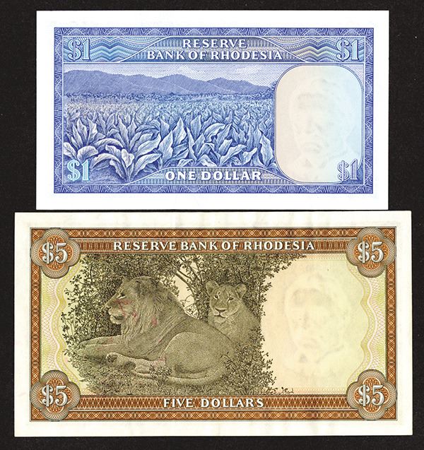 Rhodesia. 1, 5 Dollars. P-30b, 32. Arms at right. Both Choice Uncirculated, the 5 Dollar with a partial red bank hand stamp on face. 2 pieces.