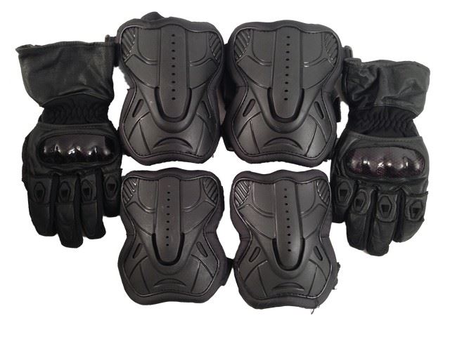 Screen used Guard 'Hazmat' suit, including: black cloth jumpsuit with gold insignia on sleeves, black mesh 4 pocket vest with velcro along the button line, black hard plastic helmet with green canvas straps, black plastic with canvas velcro straps knee and elbow guards, black leather gloves with hard plastic knuckles, black balaclava, and plastic and rubber respirator with elastic strap and logo over breathing apparatus. This is the only costume of this kind that currently exists.
