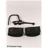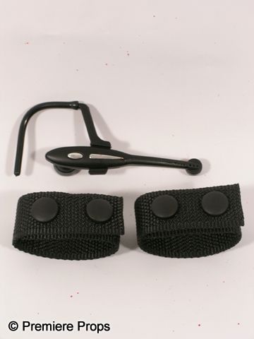 Kristian's black plastic with broken silver metal detail, earphone with brace for ear, microphone on the front, long black cord with audio plug headset, and two straps with two button clasps. (approx 5" long)