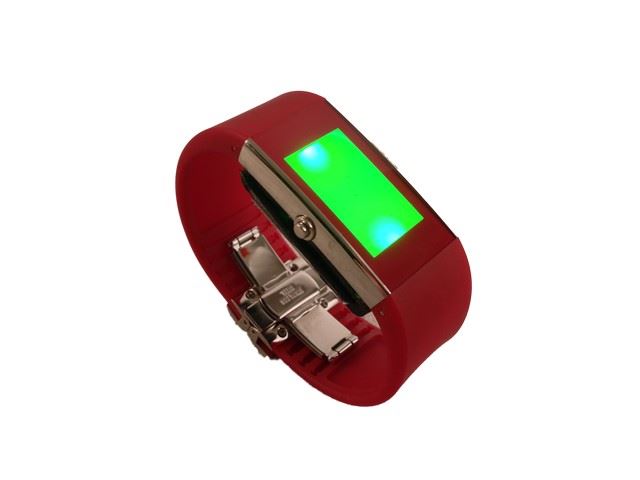 Ada Wong (Bingbing Li) 'Rosendahl' watch with red rubber band and stainless steel clasp, altered by production to make the screen glow green.