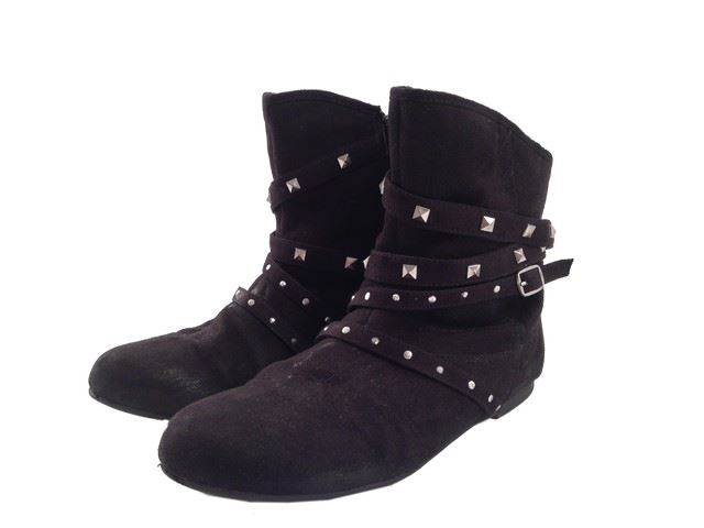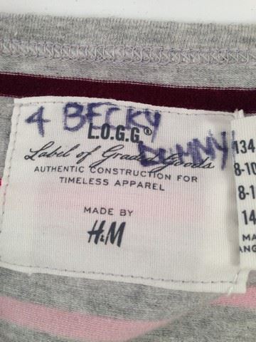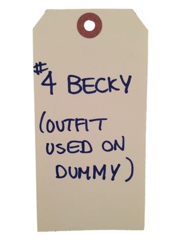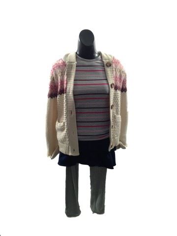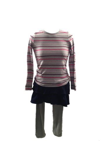 Becky (Aryana Engineer) screen worn (labeled Becky #4, outfit used on dummy), "H &M" light grey t-shirt with horizontal stripes (Size 8), "Gap Kids" cream knit sweater with pattern(size 8), Light grey "Gap Kids" leggings (size 8), blue denim ruffle skirt "Gap Kids" (size 8), cream underneath long sleeve shirt with black faux suede ankle boots with square studs (size 3).