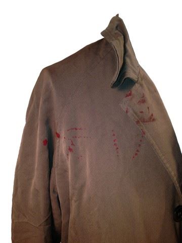 Japanese Undead (Mark Chin) screen worn, light production blood on shoulder of light brown micro fiber trench coat (size unknown)."#158B Shubuya" scene.