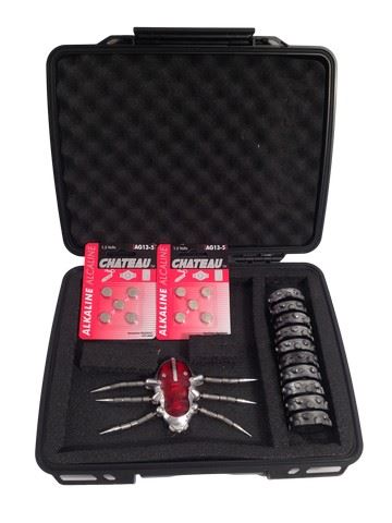 Jill Valentine (Sienna Guillory) screen used, hero scarab kit. Includes a metal scarab with red plastic head, 10 rubber, magnetic neural ports and extra batteries, inside a "Pelican" case. (Scarab: Approx. 4"x6", case: Approx. 12"x10"). This is the only hero scarab for Jill Valentine's character from the set of production. Includes prop tag.