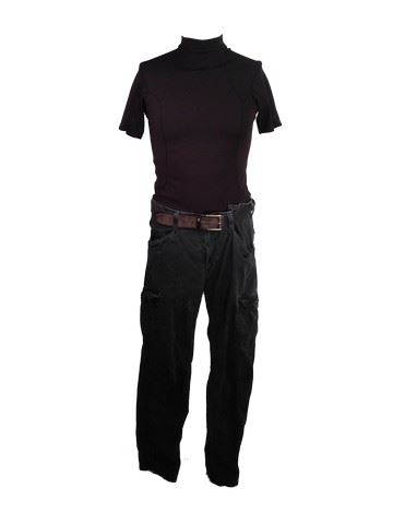 Leon S. Kennedy (Johann Urb) screen worn, stunt, black mock neck shirt with fine ribbing, "J brand" charcoal grey cargo pants (w36x3) tan/caramel lace up ankle "Timberland" boots. (size 10.5).