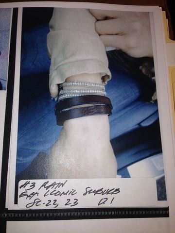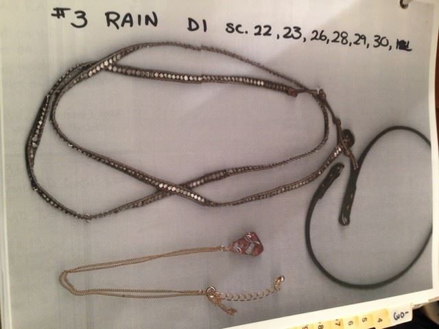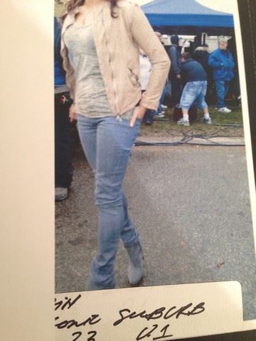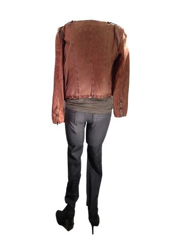 Rain (Michelle Rodriguez) screen worn, hero, grey"Diesel" jeans (size 27W), grey "Alternative" tee shirt(LG), light brown "GIORGIO Brato"leather jacket, crystal stone necklace with two wrap bracelets and shoes used in stunt: grey "Zara" suede high heel booties (size 39).