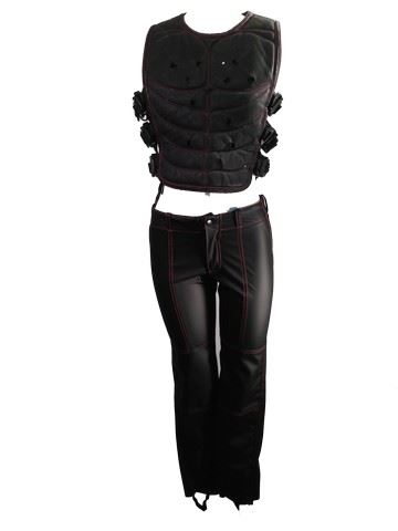 Rain (Michelle Rodriguez) screen worn, "bad rain # 3, used in water sequence" black pleather pants (rider stirrups on bottom) (size 27W), black leggings and small black bullet proof vest (bullet holes on front & back) with real side buckles, and black Dr. Martens black lace up boots with grommets (labeled "#3 rain boots for water work"). Includes wardrobe tag.